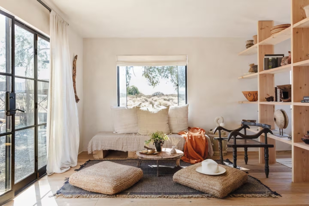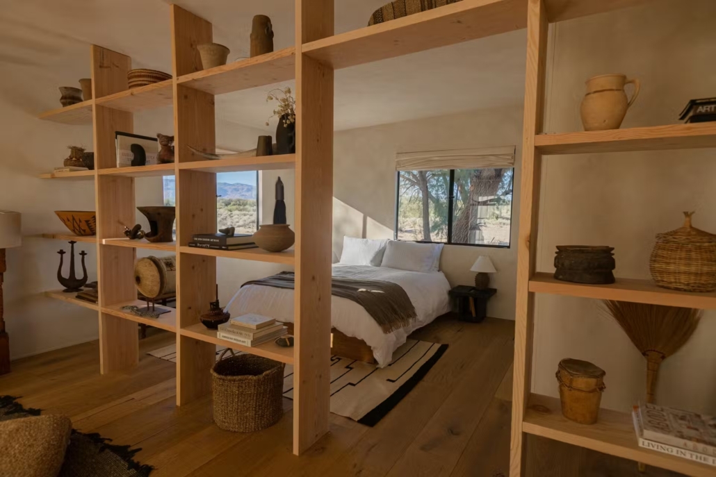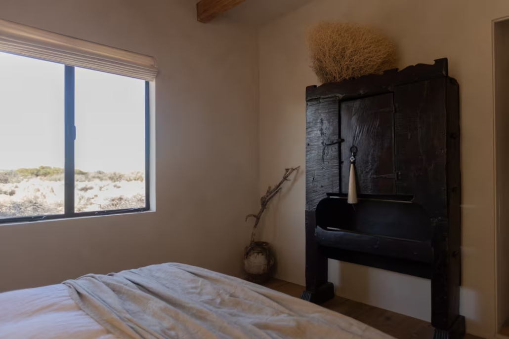 Arro Dunes si trova su un ampio lotto desertico, circondato da sabbia, vegetazione spontanea e orizzonti aperti. La casa non cerca di imporsi sul paesaggio, ma di convivere con esso. Gli ambienti interni sono organizzati in modo semplice, senza compartimentazioni rigide, lasciando che la luce naturale attraversi gli spazi durante il giorno e ne modifichi continuamente la percezione. Il progetto è stato realizzato da Studio Marrant, studio di interior design con sede a Los Angeles fondato da Kelsey Coppetti e Dustyn Ellis. Arro Dunes è uno dei lavori che meglio raccontano il loro approccio: diretto, concreto, fortemente legato al fare. Qui progettazione e realizzazione non sono due fasi separate, ma procedono insieme, spesso sullo stesso piano.