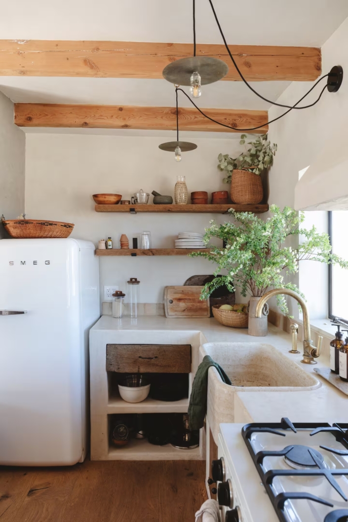 In Arro Dunes il tadelakt trova uno dei suoi utilizzi più interessanti e meno scontati: la cucina. In un contesto come quello del deserto californiano, dove la cucina è spesso il vero centro della casa, questa scelta diventa strutturale, non decorativa. Il tadelakt viene utilizzato in modo esteso e coerente. Riveste le pareti, sale fino ai soffitti, avvolge la struttura della cucina e diventa persino piano di lavoro, realizzato in una tonalità naturale, un beige chiaro che dialoga con la luce intensa del deserto senza rifletterla in modo aggressivo. La superficie è continua, senza interruzioni, e restituisce una sensazione di solidità e calma che raramente si ritrova nelle cucine contemporanee.