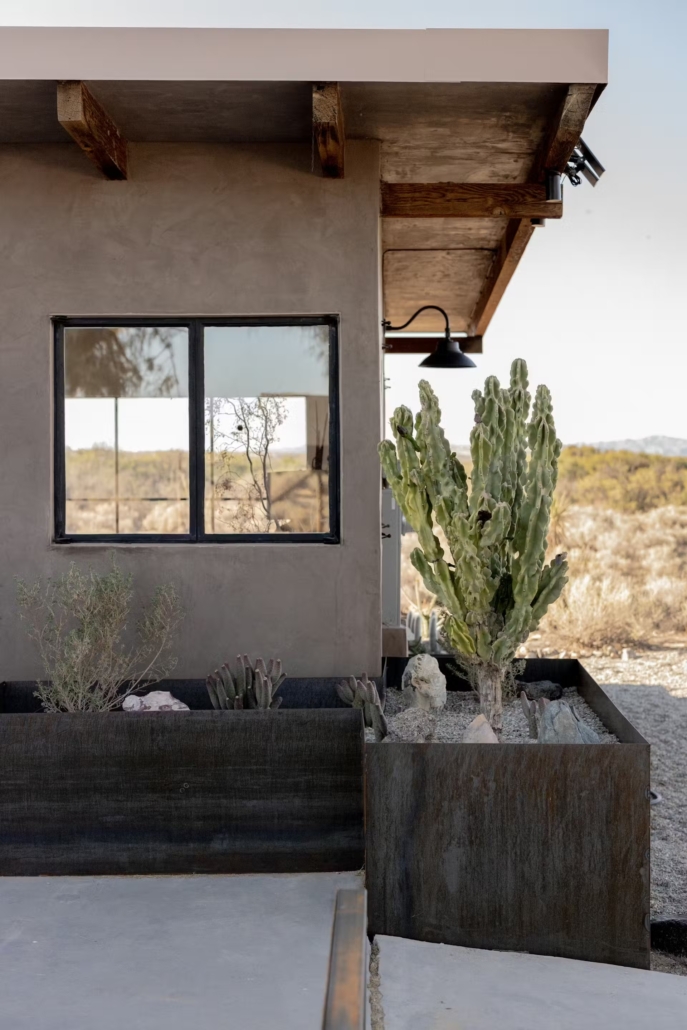 La formazione dei due fondatori è diversa ma complementare. Da un lato una sensibilità legata al mondo della ceramica e degli oggetti fatti a mano, dall’altro un’esperienza più pratica nella costruzione e nella fabbricazione. Questo equilibrio si riflette chiaramente negli spazi della casa, dove nulla appare applicato a posteriori. La scelta dei materiali è ridotta e coerente. Le pareti sono trattate con intonaci naturali, i pavimenti in cemento dialogano con arredi in legno grezzo, realizzati in gran parte su misura. Tutto è pensato per funzionare bene in un ambiente desertico, dove le escursioni termiche e la luce mettono alla prova qualsiasi superficie.