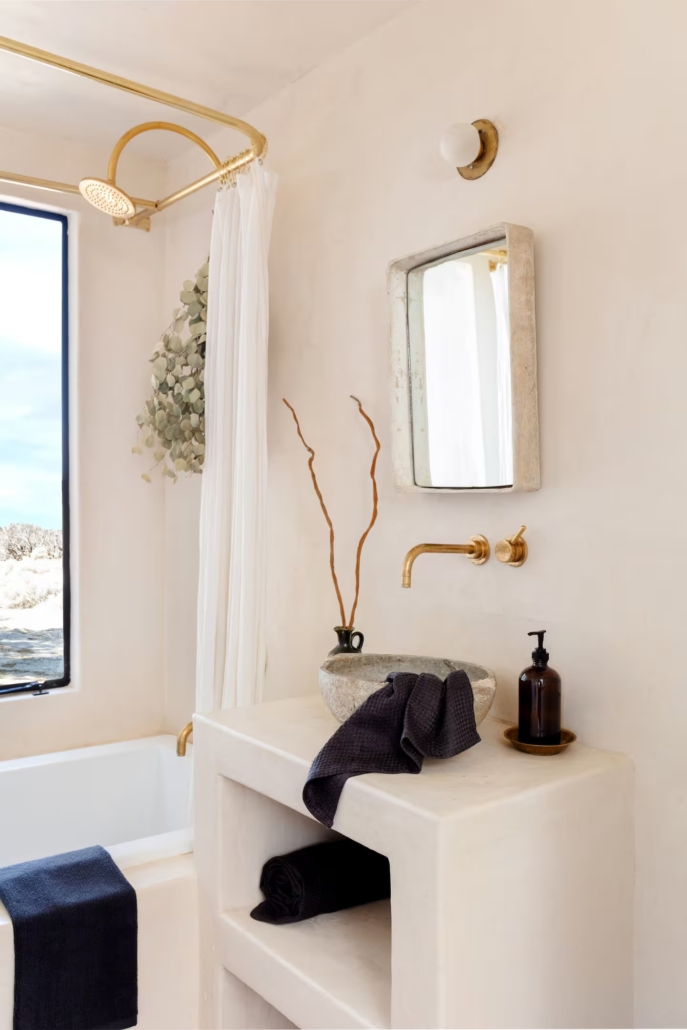 Anche il bagno prosegue lo stesso ragionamento materico della cucina. Il tadelakt viene utilizzato per il rivestimento della vasca e per il piano del lavandino, creando una continuità visiva e tattile che rafforza l’idea di uno spazio costruito più che arredato. Le superfici sono lasciate in una tonalità naturale e morbida, capace di assorbire la luce e restituire una sensazione di calma, perfettamente in linea con il ritmo lento della casa. In un ambiente esposto a vapore e umidità, il tadelakt svolge anche una funzione tecnica precisa, dimostrando come questa finitura possa essere utilizzata in modo pratico e duraturo, senza rinunciare alla qualità estetica.