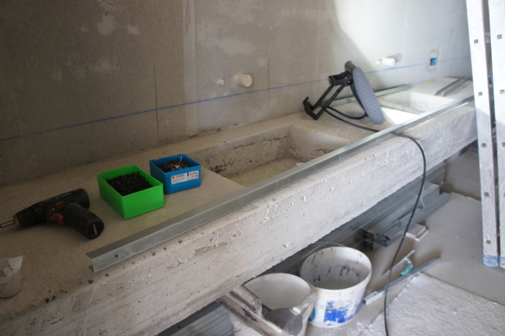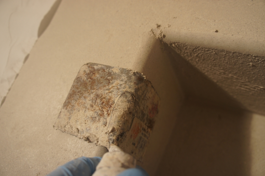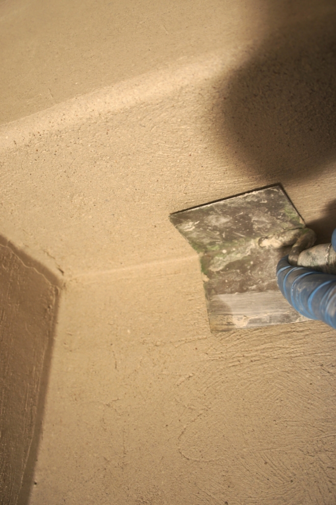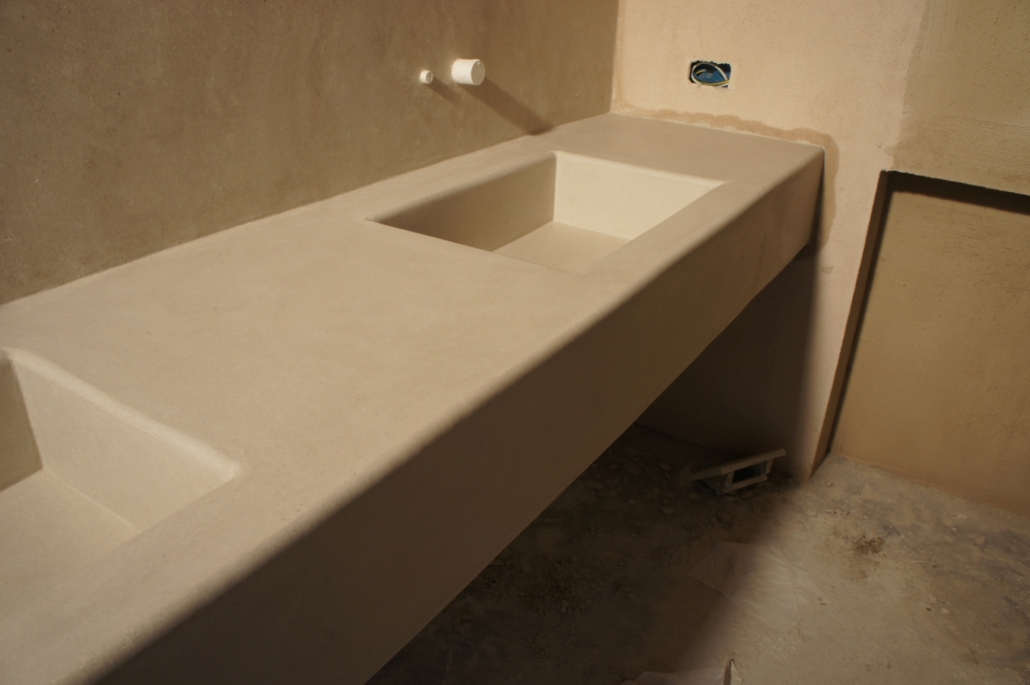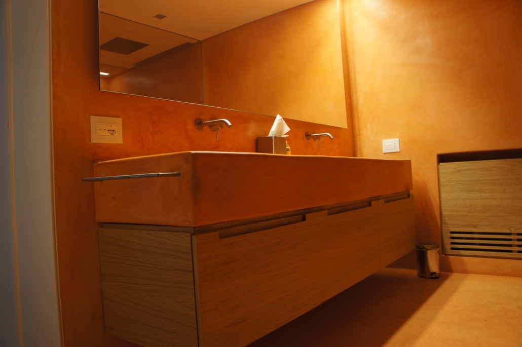 L’intonaco di partenza era un premiscelato a base calce, non troppo ruvido. Per questo abbiamo usato la calcina T6 come fondo, applicandola anche sui lavandini in cemento armato, la cui superficie risultava eccessivamente liscia per accogliere la lavorazione successiva.
