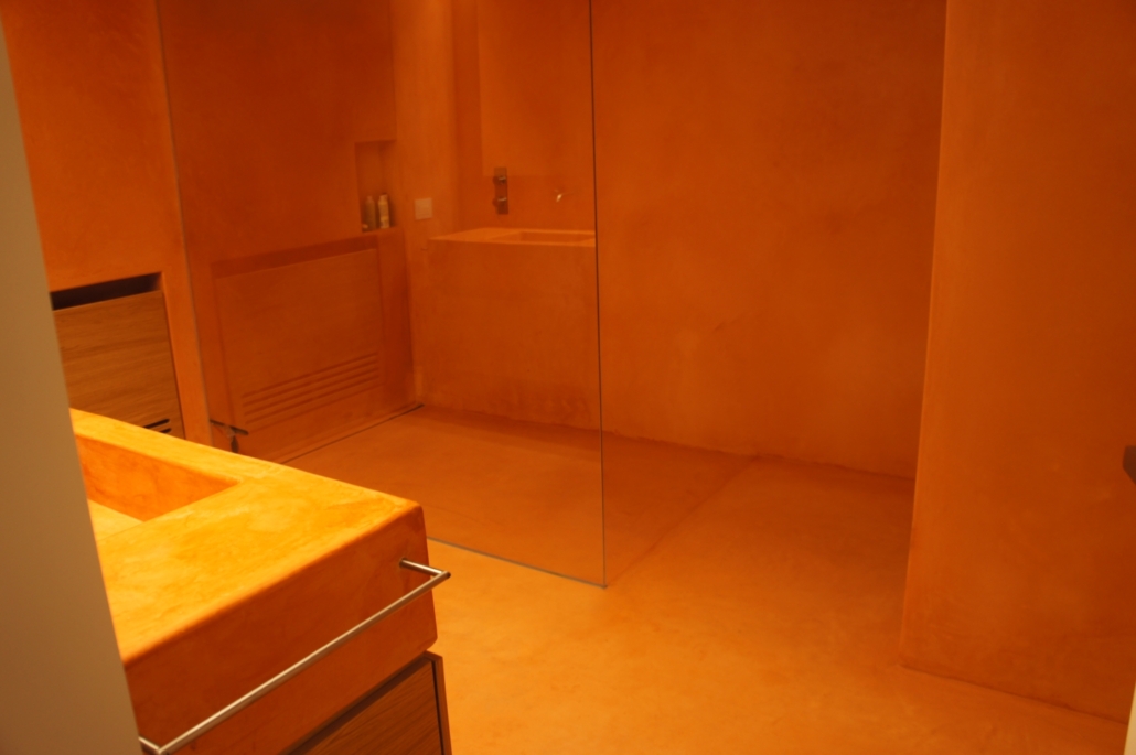 Su richiesta dell’architetto, abbiamo scelto di contenere il caratteristico chiaroscuro del Tadelakt. La pietra di fiume è stata passata con estrema delicatezza, appena sfiorando la superficie, così da conservare un colore uniforme e una presenza più calma, senza l’effetto marezzato che spesso accompagna questa tecnica.
