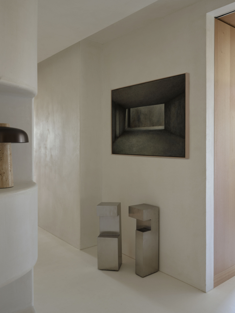 Nel complesso, il tadelakt qui non è usato per “caratterizzare” il bagno, ma per costruirlo. Ogni elemento, dal lavabo alla doccia, dalle nicchie al soffitto, è parte di un sistema artigianale che privilegia continuità, durabilità e rapporto diretto con l’acqua. È una scelta tecnica prima che estetica, coerente con l’impostazione materiale dell’intero progetto.