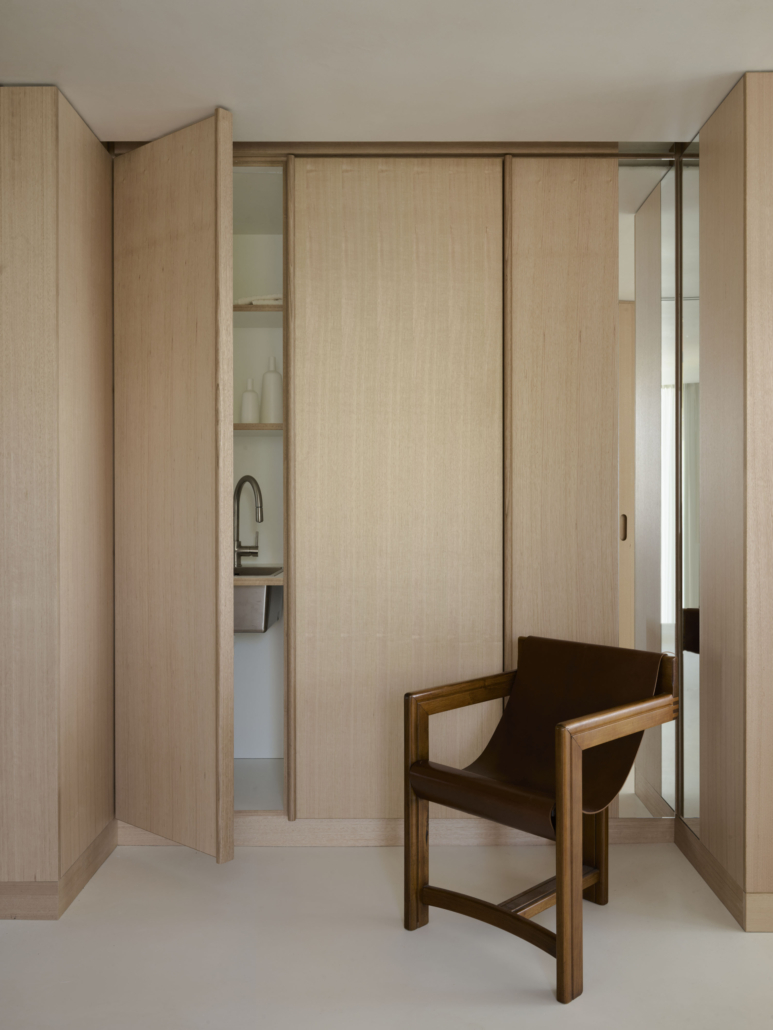 Il bagno di Darling Point Apartment, a Sydney, mostra un uso del tadelakt misurato e coerente con il contesto costruttivo del progetto. Non è un elemento isolato né un segno di stile. È una soluzione tecnica applicata dove serve: superfici umide, uso quotidiano, necessità di continuità e facilità di manutenzione. In un clima come quello costiero australiano, con umidità presente e temperature relativamente stabili, il tadelakt lavora bene come involucro minerale continuo. Pareti, soffitti ed elementi integrati riducono i punti critici tipici dei bagni tradizionali e permettono una gestione semplice dell’acqua e del vapore. La scelta di realizzare lavabo, doccia-vasca e nicchie nello stesso materiale rafforza questa logica: meno giunti, meno materiali diversi, maggiore controllo nel tempo.All’interno di un intervento basato su materiali naturali, finiture minerali e soluzioni a bassa complessità tecnologica, il tadelakt trova una collocazione logica.