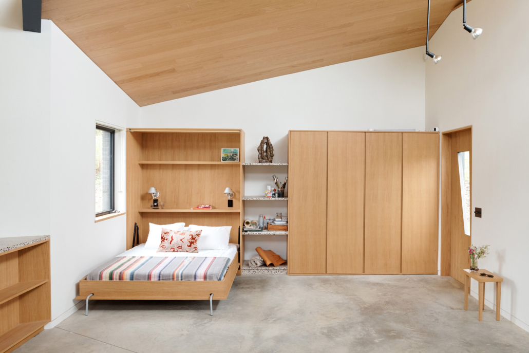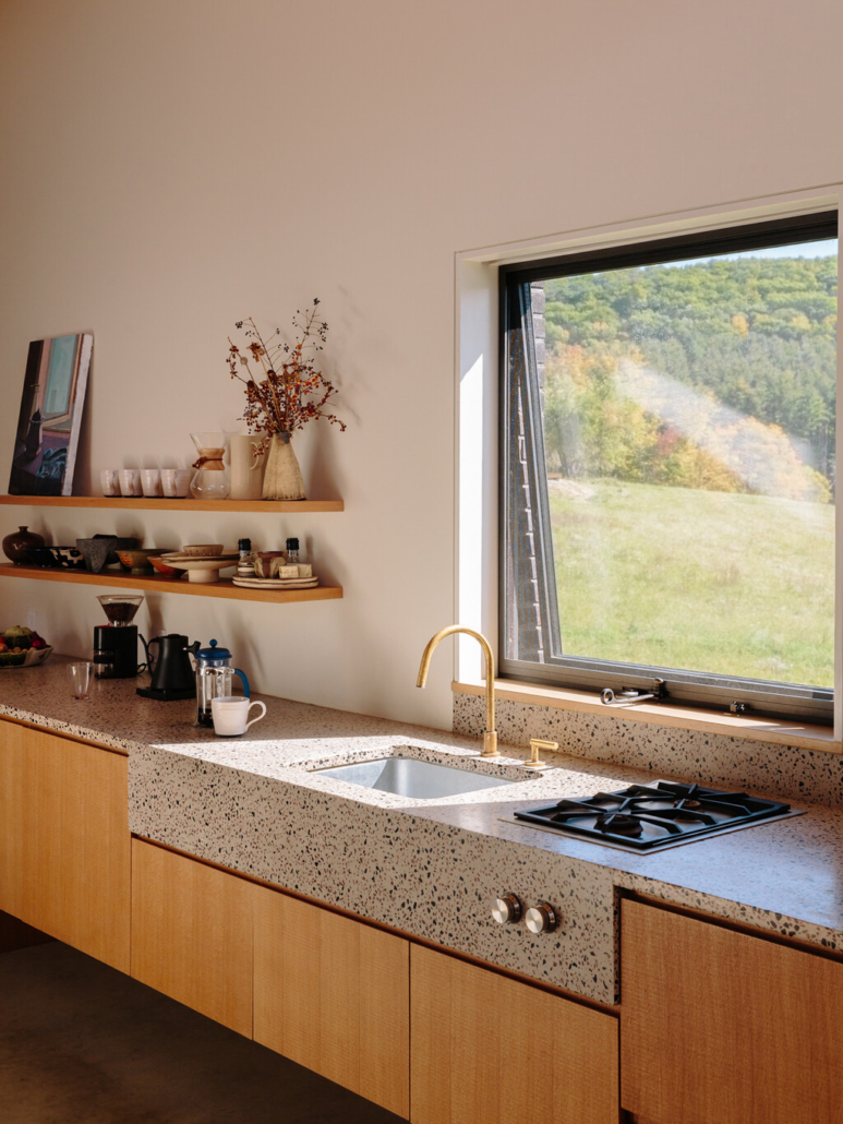 Il Dutchess County Studio non è una casa convenzionale: è una combinazione di abitare e lavorare in un unico spazio, pensata per sperimentare una presenza più lenta nel paesaggio rurale piuttosto che semplicemente “abitare fuori città”. Questa intenzione emerge da come sono trattati i materiali, le superfici e le aperture, tutti orientati a creare un ambiente che risponda alle condizioni climatiche locali e allo stesso tempo sia sensibile al contesto naturale.