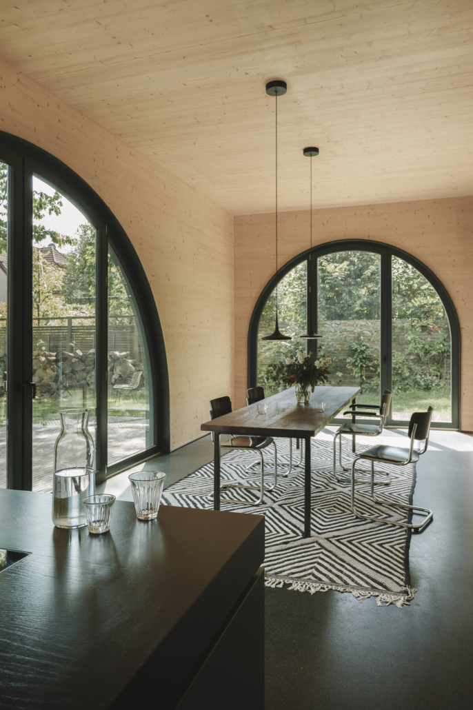 La casa, sviluppata su due livelli con sottotetto e parzialmente interrata, ha una pianta quasi quadrata e una forma coerente ma discreta. Atelier ST ha scelto un intonaco minerale verde scuro per la facciata esterna, permettendo alla costruzione di mimetizzarsi con la vegetazione circostante, una soluzione che evidenzia la volontà di far dialogare l’edificio con il paesaggio piuttosto che imporsi su di esso.