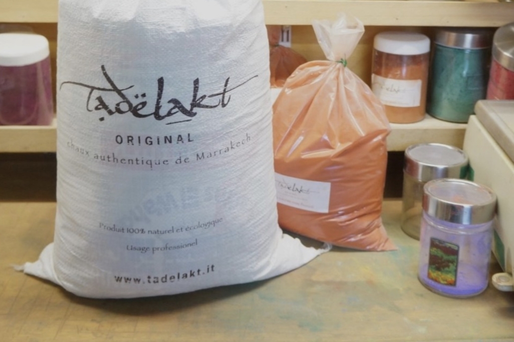 La calce di Marrakech, utilizzata per il Tadelakt, e l’ocra rossa marocchina provengono entrambe dalle aree dell’Atlante e dai territori attorno alla città. Questa prossimità geografica ha fatto sì che, per secoli, gli artigiani marocchini combinassero spontaneamente calce e terra rossa negli intonaci, negli hammam, nei riad e nelle architetture monumentali. Il risultato non era solo funzionale, ma profondamente armonico: il rosso, inglobato nella matrice calcarea, non restava in superficie come una pittura, ma diventava parte integrante del materiale.