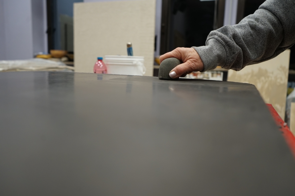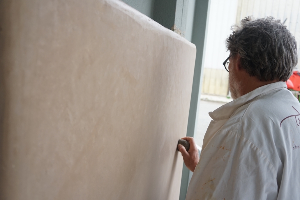 La funzione principale della pietra è quella di comprimere la superficie del Tadelakt nel momento corretto della presa. Quando la calce è ancora leggermente umida ma ha già iniziato il processo di indurimento, la pressione esercitata dalla pietra chiude progressivamente i pori superficiali, riducendo drasticamente l’assorbimento dell’acqua. Questo passaggio non avviene per abrasione, ma per compressione plastica della materia: la calce viene letteralmente “massaggiata”, riorganizzando la sua struttura superficiale.