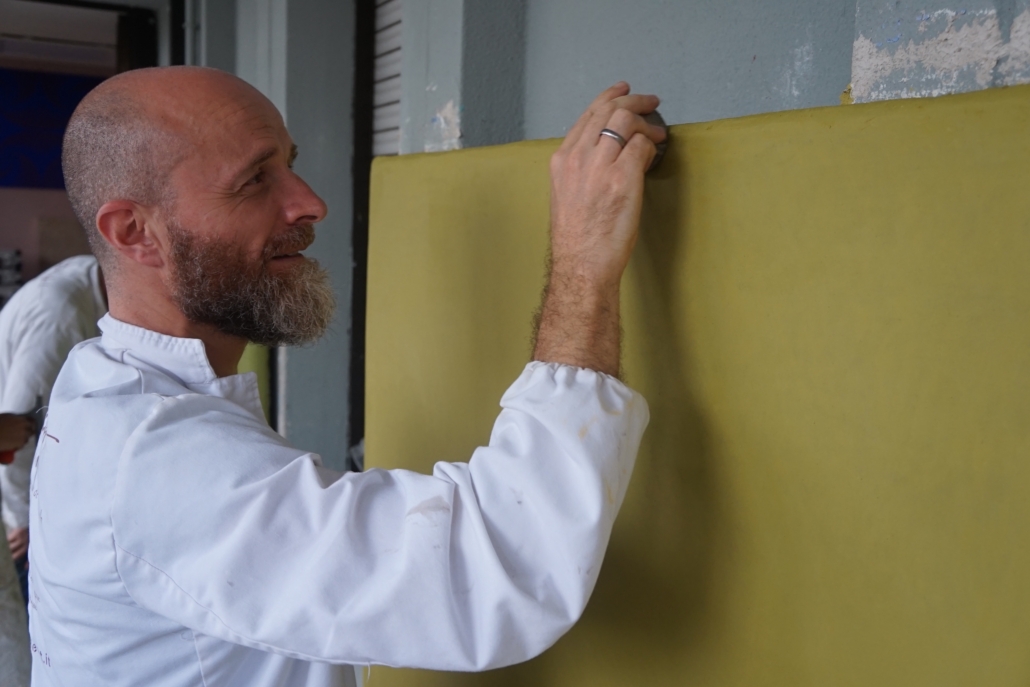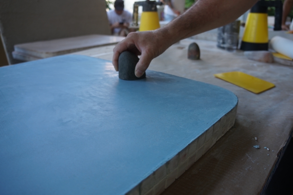 Durante questa fase entra in gioco anche il sapone nero marocchino, che reagisce chimicamente con la calce formando sali di calcio insolubili. La pietra facilita questa reazione distribuendo il sapone in modo uniforme e aiutando la sua penetrazione controllata negli strati superficiali. Il risultato è una superficie che diventa idrofuga per natura, senza l’uso di film, resine o protettivi esterni.