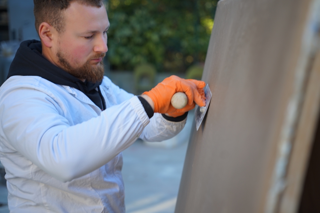 Nella prima fase di stesura, eseguita con il frattone in legno, la pressione non è un fattore particolarmente critico. Questa è la parte più “grezza” della lavorazione, in cui il materiale viene distribuito e impostato sulla superficie. È sufficiente applicare una pressione regolare e costante, evitando sia un’eccessiva forza, che schiaccerebbe inutilmente il materiale, sia una stesura troppo leggera, che non permetterebbe una buona adesione e compattezza iniziale.