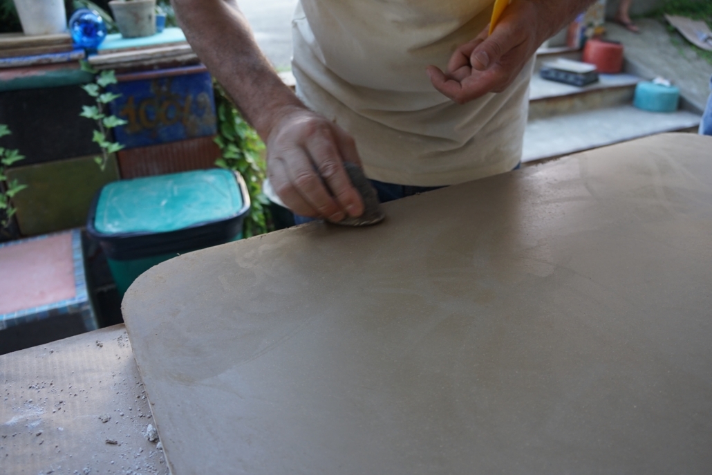 Anche il passaggio della pietra di fiume, utilizzata insieme al sapone nero, richiede una grande attenzione alla pressione. Qui il rischio principale, se si esercita troppa forza, è quello di creare abrasioni, graffi o piccole scheggiature, che rimarranno visibili una volta terminato il lavoro. Al contrario, una pressione troppo leggera non consente al sapone nero di penetrare correttamente nella superficie, compromettendo il processo di saponificazione e quindi la naturale impermeabilità del Tadelakt.