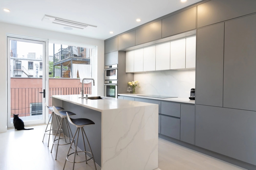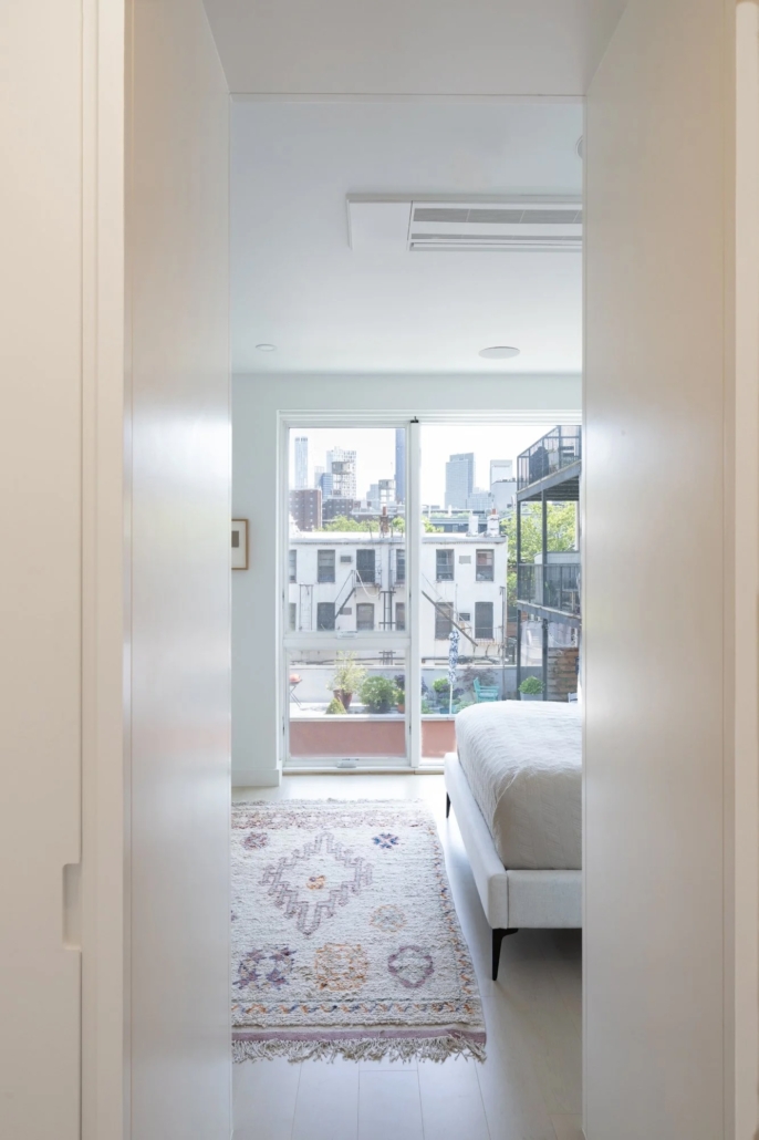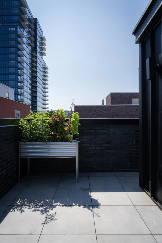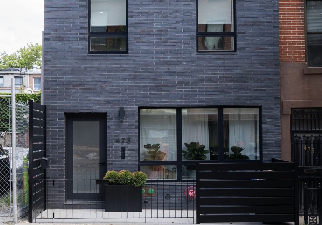 Esternamente, la casa si presenta con una facciata in mattoni scuri e aperture dal taglio contemporaneo, un contrasto misurato che mantiene rispetto per il tessuto urbano storico di Gowanus pur proponendo un’immagine sobria e attuale. Le stesse scelte sono visibili nei serramenti in alluminio color carbone che, assieme a giunti ridotti e cornici essenziali, rendono la facciata pulita ma non anonima.