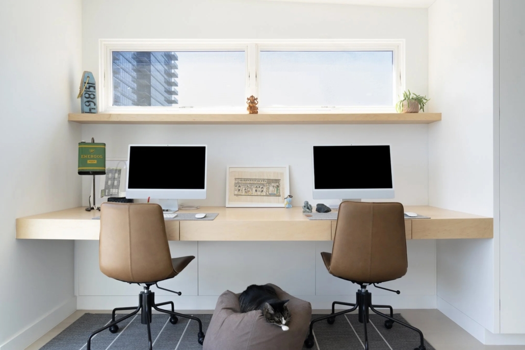 L’interno è caratterizzato da una palette di materiali neutri e tattili. La pavimentazione in leggerezza di acero chiaro e le superfici bianche aiutano a massimizzare la luce naturale che filtra attraverso le finestre ben posizionate. Le scale con gradini in acero e corrimano personalizzati fungono da elemento verticale continuo, accompagnando la vista da un piano all’altro senza interruzioni brusche di materiale o colore.