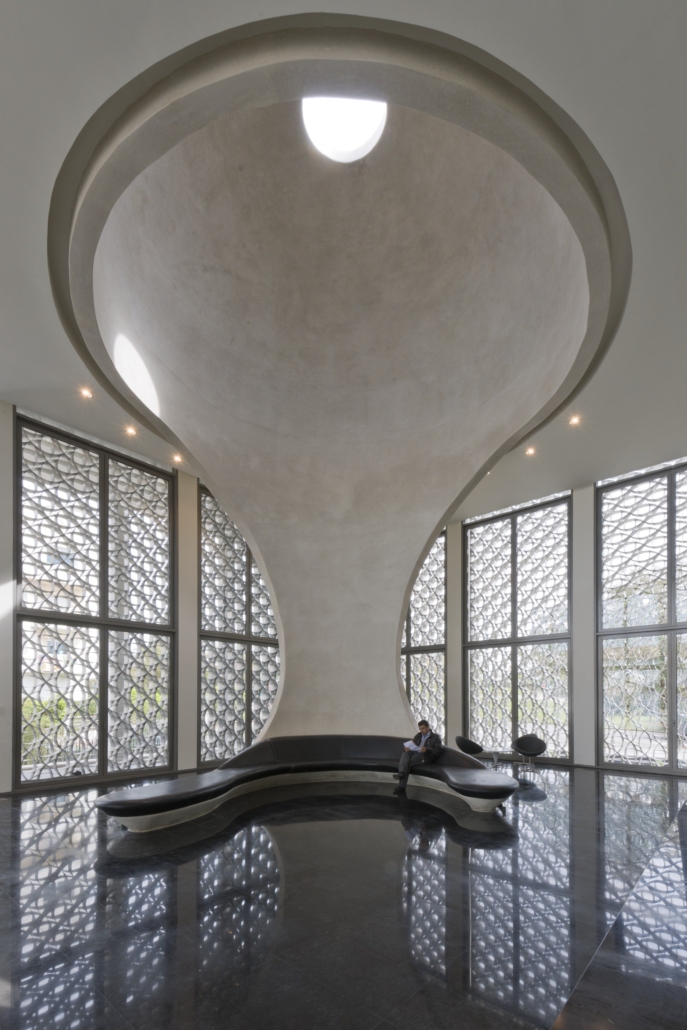 Il progetto si basa su un approccio modulare, con edifici organizzati attorno a una griglia strutturale e caratterizzati da un colonnato d’ingresso e da un elemento volumetrico ricorrente: la volta sormontata da una cupola. La soffittatura di questa volta è rivestita in tadelakt, una tecnica tradizionale marocchina di intonaco in calce, mentre l’esterno è rivestito in zellige, la ceramica smaltata tipica del paese.