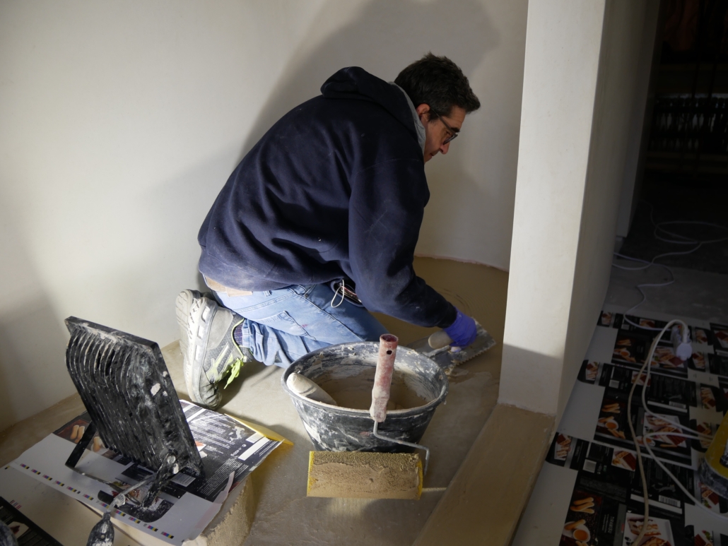 Malgrado facesse freddo e le giornate fossero umide, l’intonaco era molto traspirante e assorbiva tanta acqua. Per questo motivo è stato necessario bagnare abbondantemente la superficie, in modo da mantenere il giusto livello di umidità per assicurarci di avere il tempo necessario a completare il lavoro. Se l’intonaco si fosse asciugato troppo in fretta, non sarebbe stato possibile far aderire gli strati di Tadelakt.