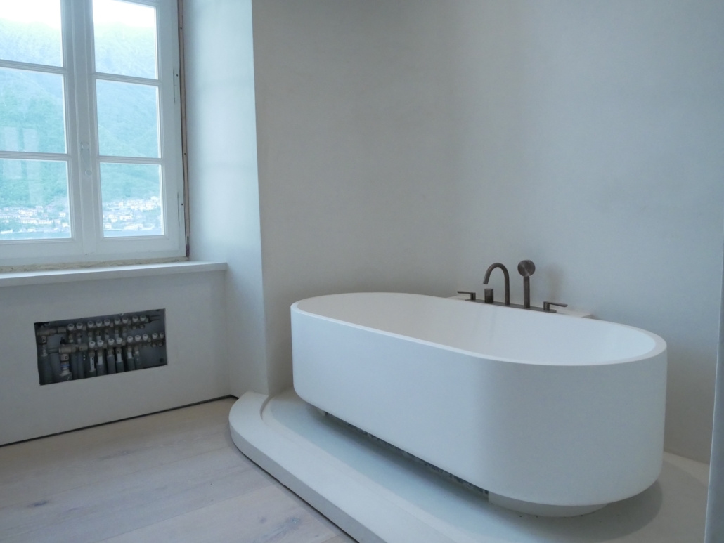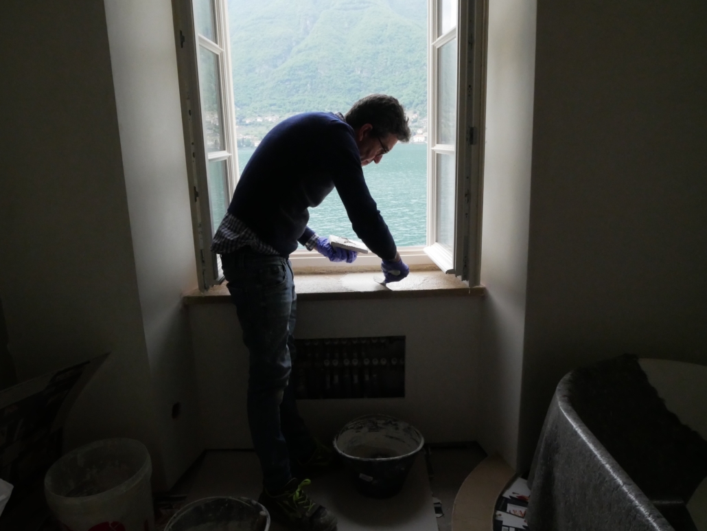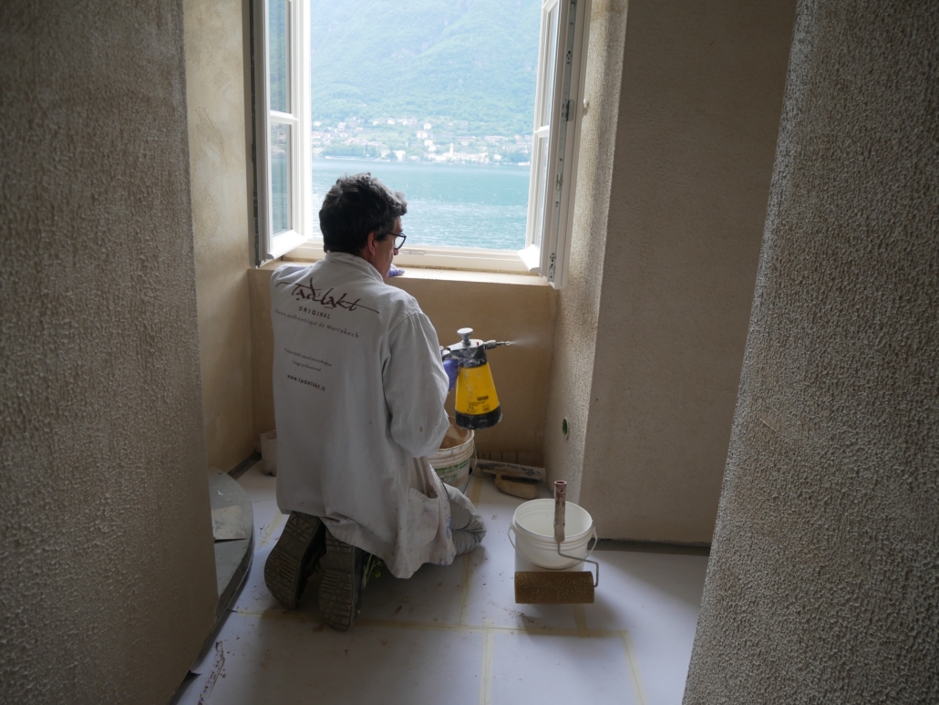 La committenza ha scelto colorazioni molto chiare e naturali, in linea con l’eleganza della villa e con la luce del Lago di Como. Lo stile richiesto era quello tipico degli ambienti di lusso: un Tadelakt molto ben lucidato, lavorato con spatola in acciaio, con superfici compatte, uniformi e prive di imperfezioni visibili. Ogni fase, dalla stesura alla compressione fino alla lucidatura finale, è stata eseguita con estrema precisione.