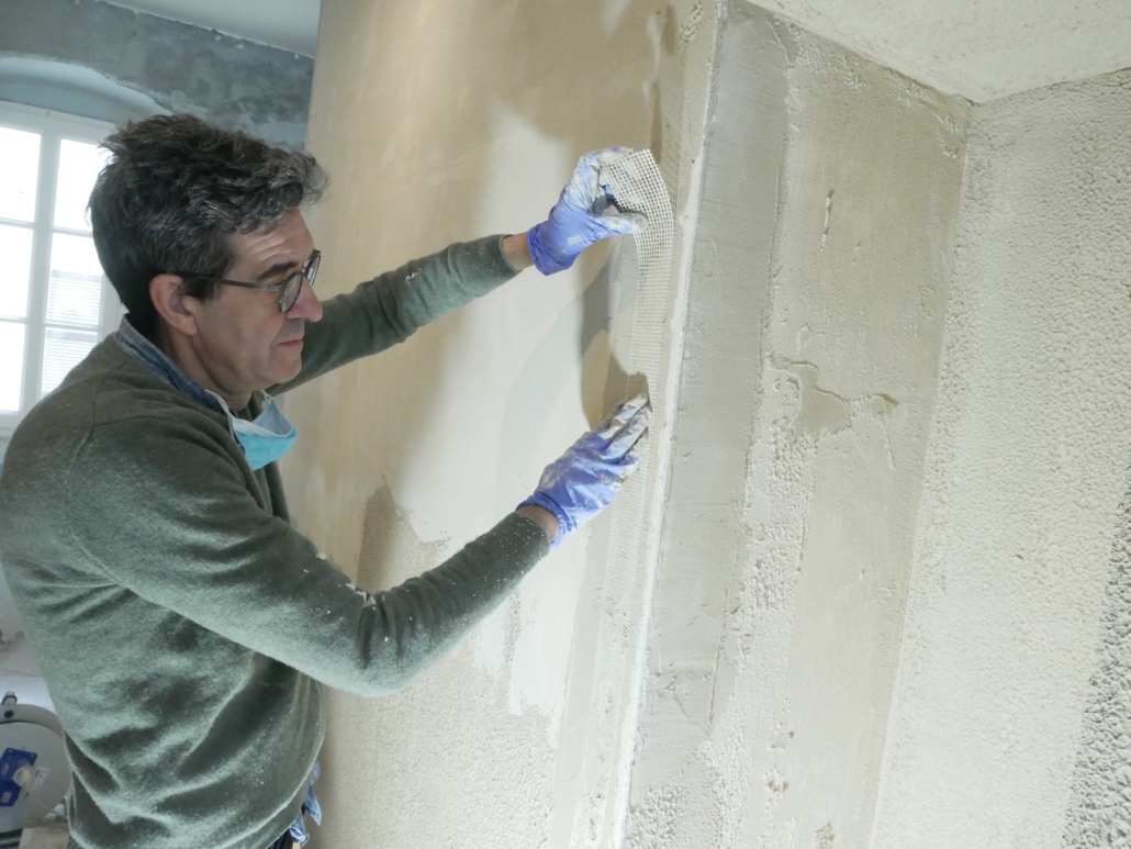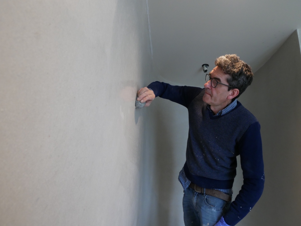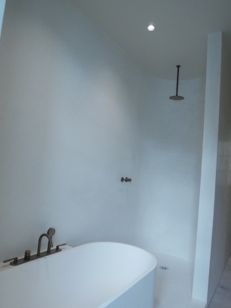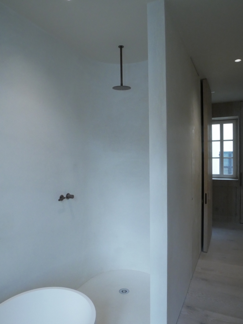 L’applicazione del Tadelakt vero e proprio è avvenuta in due strati, fresco su fresco e procedendo gradualmente, lavorando su una piccola area di superficie per volta. Oltre che all’insegna dell’ecologia, la casa è stata rinnovata con uno stile estetico molto attuale. Per mantenere intatto questo spirito, su richiesta della proprietaria, abbiamo schiarito leggermente la tinta naturale del Tadelakt con una piccola aggiunta di bianco di titanio, per conferire un tocco di modernità pur mantenendo intatti la morbidezza e il calore che lo caratterizzano.