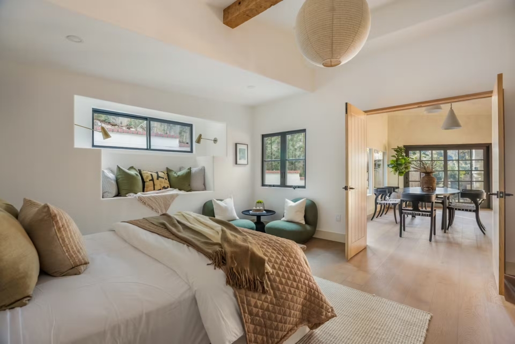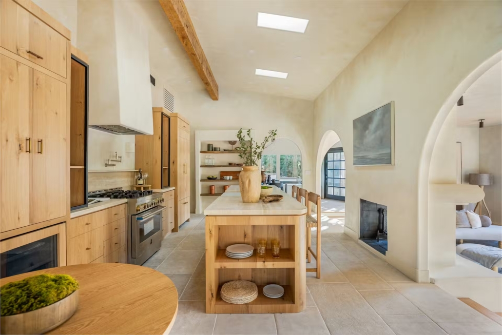 Questa casa in stile Spanish/Mediterranean Revival si trova nel cuore di Topanga Canyon, un territorio nella zona della celebre California che da sempre sfuma tra natura selvaggia e cultura creativa legata al surf, alla musica e all’arte. La residenza, costruita negli anni ’30 e rifinita con dettagli originali, è stata completamente rinnovata e ripensata per coniugare il carattere storico con soluzioni contemporanee, pur restando profondamente ancorata alla propria identità architettonica. Il progetto è stato curato dall’interior designer Allie Boesch, che ha lavorato su dettagli tattili più che su grandi gesti formali. Qui gli archi spagnoli, le superfici in intonaco morbido e la pianta aperta sono letti come elementi che parlano di clima mediterraneo, clima californiano e di un modo di abitare che privilegia legame con la luce naturale e con il paesaggio esterno.