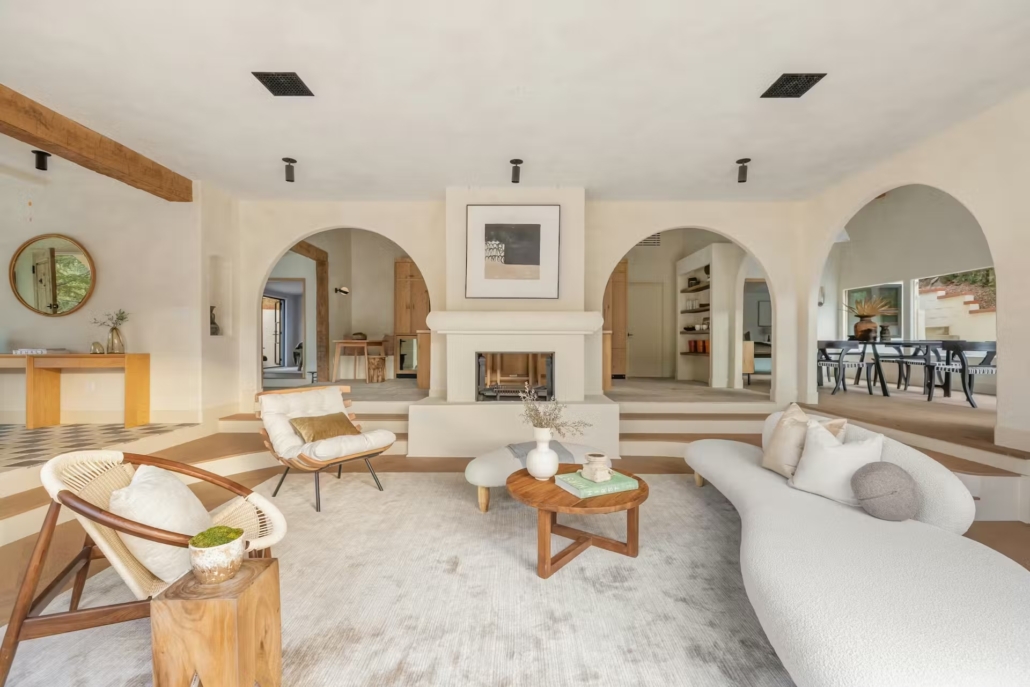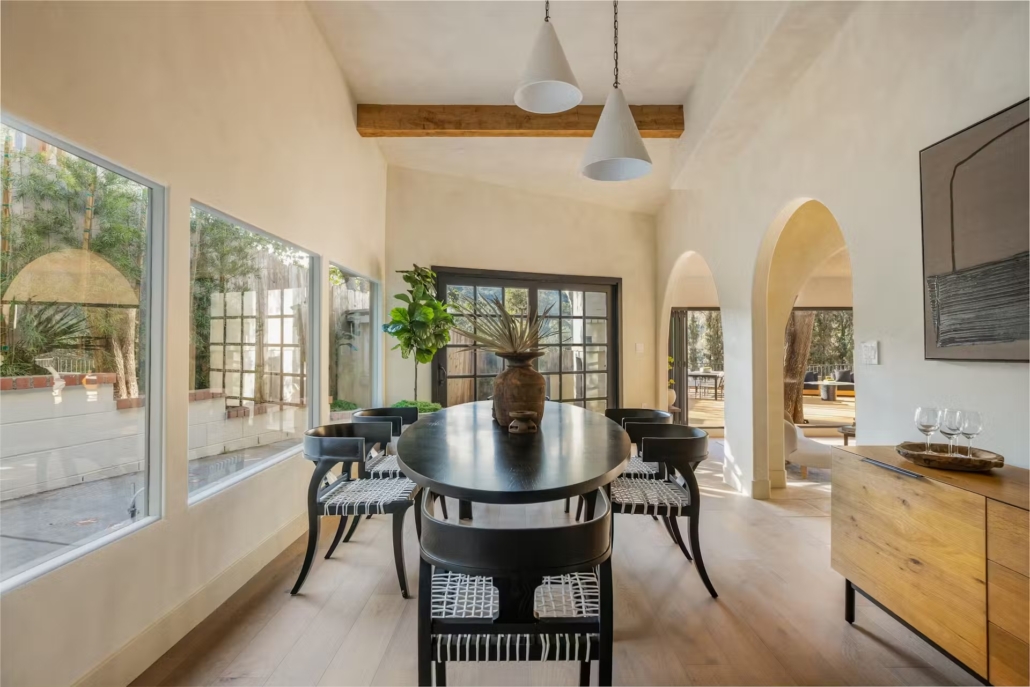 Le aperture ad arco e la connessione visiva con il giardino sottolineano quanto l’abitazione sia pensata come interno aperto alla luce e al paesaggio. Questo rapporto diretto con l’esterno è parte della tradizione mediterranea, qui reinterpretata sul territorio californiano, dove la natura e gli spazi aperti sono elementi forti del clima abitativo.