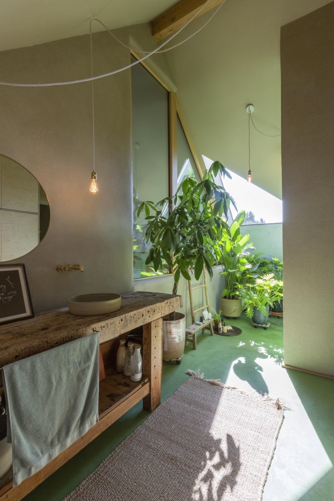 In Under the Willow Tree House, il tadelakt viene usato in modo deciso nel bagno, ed è sufficiente per cambiare completamente la percezione dello spazio. Il pavimento è interamente realizzato in tadelakt, in una tonalità di verde intensa, quasi vegetale. Non è un verde smorzato o neutro, ma un colore pieno, che richiama direttamente le foglie, l’erba, il giardino che circonda la casa. Camminarci sopra significa percepire subito una differenza rispetto al resto degli ambienti, dove le superfici restano più asciutte e leggere.