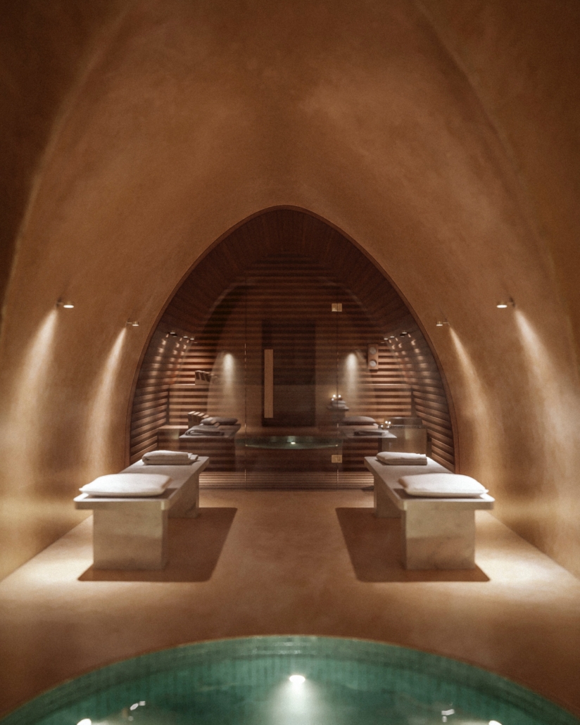 La scelta di realizzare un hammam vero, e non una spa “interpretata”, ha un peso culturale preciso. Il tadelakt nasce e attraversa secoli di architettura mediterranea e nordafricana proprio in questi spazi: luoghi di cura, di igiene, di socialità lenta. Inserirlo qui, nel Libano montano, non è un gesto nostalgico. È una continuità geografica e climatica che ha senso oggi quanto ieri.