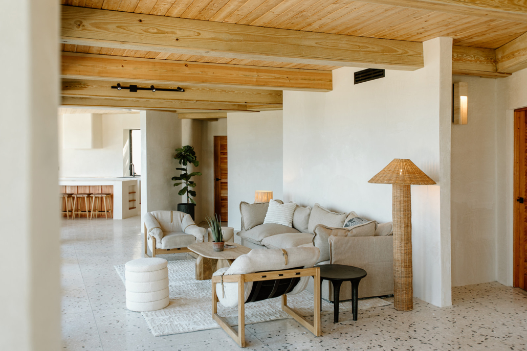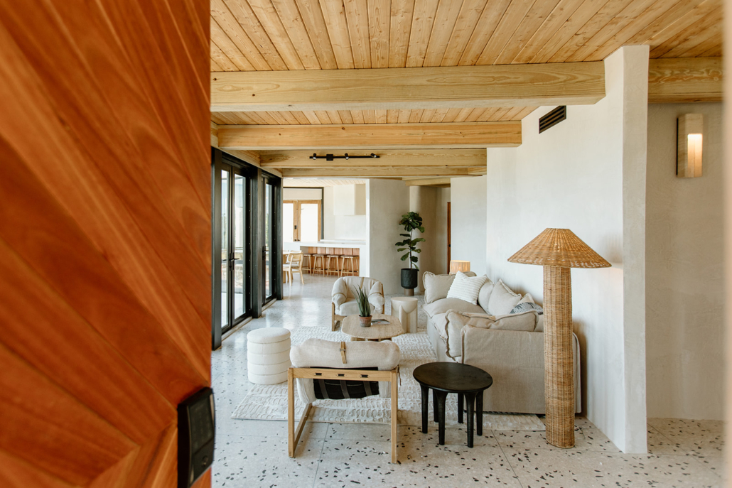 Quando Chris Pardo acquista la proprietà, la casa è in condizioni critiche. Il progetto di recupero parte da una valutazione chiara: conservare ciò che funziona, intervenire solo dove necessario. Alcuni elementi storici vengono mantenuti e valorizzati, come i pavimenti in terrazzo originali con il logo di Antilles Air Boats e i soffitti in legno di cipresso, che contribuiscono ancora oggi al carattere dell’abitazione.