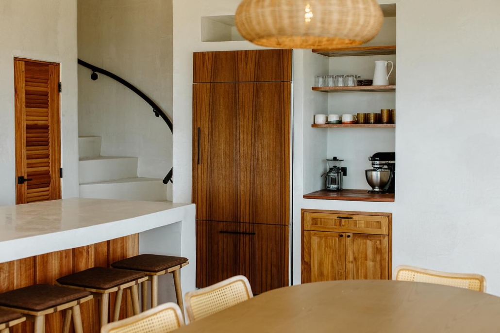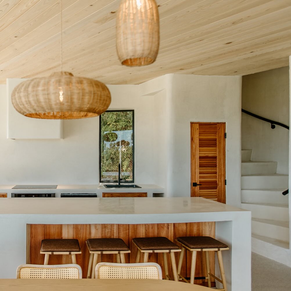 In Skyhawk Villa, l’uso del tadelakt è una decisione diretta dell’architetto e proprietario Chris Pardo, che nella ristrutturazione ha scelto di lavorare sulle superfici interne come elementi continui, capaci di rispondere sia al clima caraibico sia alla struttura atipica della casa. Il tadelakt viene utilizzato sulle superfici interne per la sua capacità di resistere a umidità e muffe, una condizione centrale in una villa affacciata sul mare nei Caraibi. Ma il progetto va oltre l’uso “protettivo” del materiale e lo trasforma in strumento spaziale.