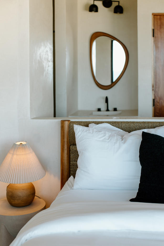 Nello stesso ambiente, il tadelakt viene utilizzato anche per realizzare i lavabi, ricavati da un unico piano continuo collocato dietro la spalliera del letto. La scelta di concentrare lavabi e superfici nello stesso materiale rafforza l’idea di un interno fluido, dove gli elementi non sono assemblati ma nati dalla stessa materia.