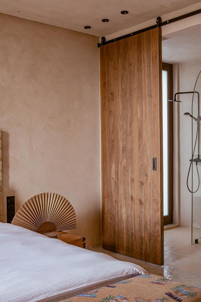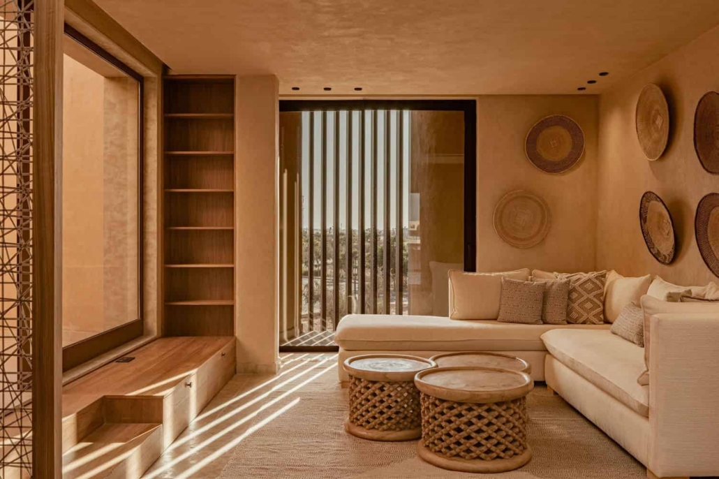 Uno degli aspetti più interessanti del progetto è l’uso del tadelakt in più tonalità, calibrate in base alla luce e alla funzione degli spazi. I colori non sono mai accesi o artificiali, ma derivano da una palette naturale che richiama la terra, la sabbia e le architetture storiche di Marrakech. Questo permette al materiale di assorbire la luce intensa del luogo e di restituirla in modo morbido, rendendo gli ambienti sempre diversi durante l’arco della giornata.