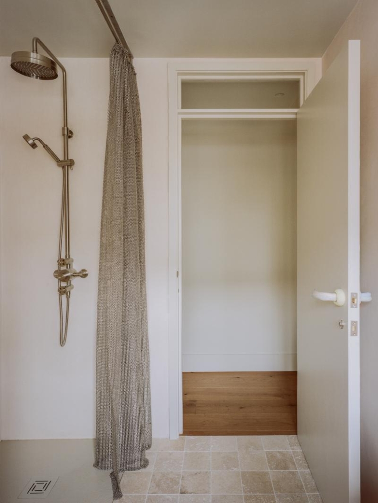 La superficie in tadelakt non è isolata a un dettaglio minimo: è parte di un elemento compositivo più ampio. Una tenda in acciaio a maglia metallica, tagliata e sospesa per creare una separazione visiva dalla zona doccia, si confronta direttamente con la parete in tadelakt, generando un contrasto di materiali che coniuga aspetto artigianale e tecnologia industriale.