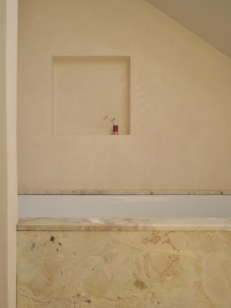 Nel progetto della House in Whitechapel, il tadelakt ha un ruolo molto concreto in uno degli spazi umidi della casa. All’interno della zona bagno, lo studio NIKJOO e Flawk utilizzano il tadelakt per rivestire le pareti del bagno compresa quella accanto alla doccia, creando una superficie continua e materica che dialoga con gli altri materiali interni.