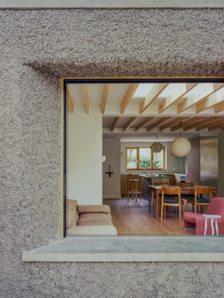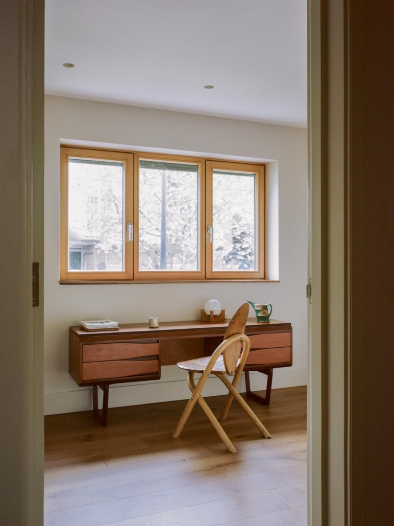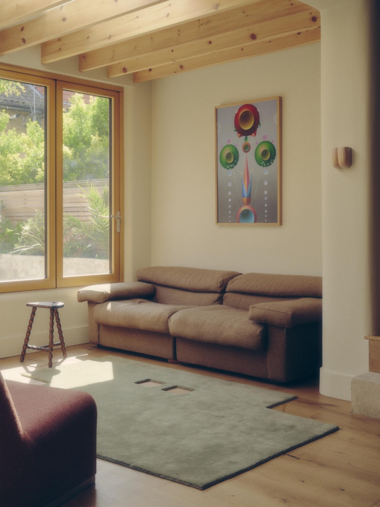 Internamente, i materiali e le finiture sono stati selezionati per creare una sensazione di continuità visiva e tattile: l’uso calibrato di calce, legno, alluminio e acciaio spazzolato accompagna la luce naturale che entra dall’alto grazie alle grandi aperture e alle nuove soluzioni di lucernari. I bordi curvi delle superfici interne smorzano le geometrie originali più rigide della casa, rendendo gli spazi più accoglienti e meno segmentati.